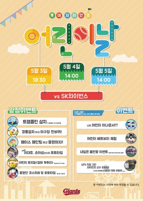 롯데자이언츠는 어린이날을 맞아 오는 3일부터 3일간 사직구장 중앙광장에서 다양한 어린이날 테마의 이벤트를 실시한다.