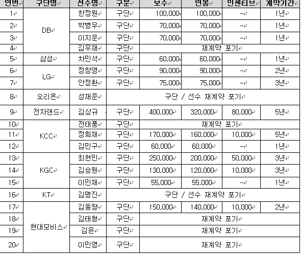그리고 김상규(전자랜드), 정희재(KCC), 전태풍(KCC), 최현민(KGC), 한정원(DB) 등 총 20명의 선수는 원소속 구단과 협상이 결렬됐다. 계약이 결렬된 선수의 영입을 원하는 구단은 5월 20일(월)까지 영입의향서를 KBL에 제출해야 되며, 한 선수에 대해 복수 구단이 의향서를 제출할 시 영입 조건이 이적 첫해 최고 연봉 금액을 기준으로 10% 이내의 연봉을 제시한 구단 중 선수가 선택할 수 있다.