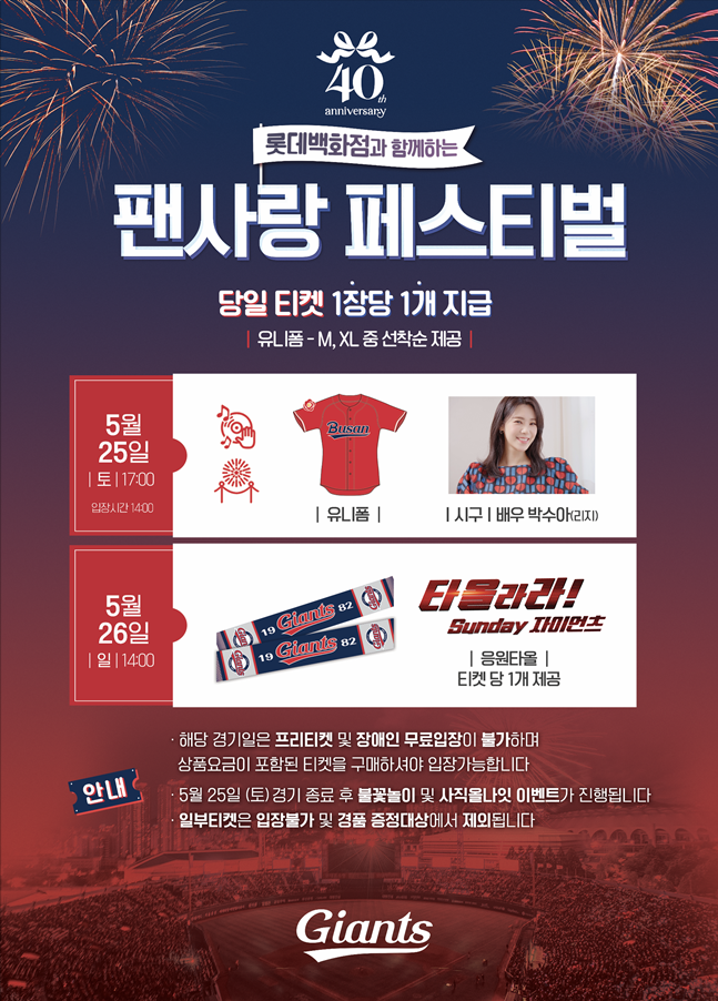 롯데자이언츠는 오는 25일과 26일 열리는 LG와 사직 홈경기에서 ‘롯데백화점과 함께하는 팬사랑 페스티벌’을 개최한다고 22일 밝혔다.