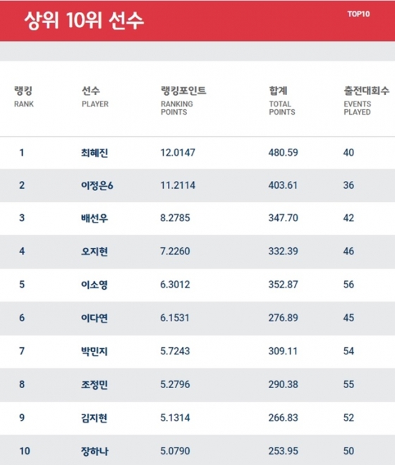 현재 K랭킹 1위는 최혜진이며 2위는 이정은6, 3위는 배선우다. K랭킹이 최근 13주 동안의 국내 투어 성적에 큰 비중을 두는 만큼 최혜진과 이정은6, 배선우의 간격은 더욱 벌어질 것으로 예상되며, 국내에서 활동하는 4위 오지현과 5위 이소영이 상위권으로 올라설 가능성이 크다.