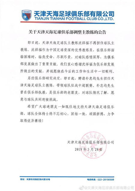 28일 톈진은 성적 부진을 이유로 션샹푸 감독을 경질하고 박충균 감독에게 지휘봉을 맡겼다.