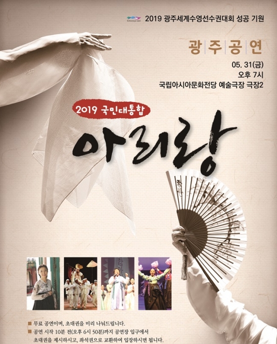 2019광주세계수영선수권대회 조직위원회(위원장 이용섭 광주광역시장)는 오는 31일 오후 7시 국립아시아문화전당에서 광주수영대회 성공 기원 ‘2019 국민대통합 아리랑’ 공연을 개최한다고 30일 밝혔다.