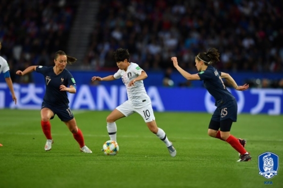 윤덕여 감독이 이끄는 한국 여자 축구대표팀은 8일 오전 4시(한국시간) 프랑스 파리 파르크 데 프랭스에서 열린 2019 국제축구연맹(FIFA) 프랑스 여자월드컵 A조 개막전에서 전반 8분 외제니 르 소메르, 전반 34분과 전반 추가시간 웬디 르나르, 후반 40분 아만딘 앙리에게 실점해 프랑스에 0-4로 패했다.