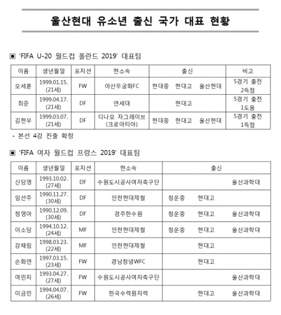 ‘역대급’ 경기로 FIFA U-20 월드컵에서 4강 진출을 확정 지은 U-20 대표팀에서는 공격수 오세훈(현대중-현대고 출신), 미드필더 최준(현대고 출신), 수비수 김현우(현대중-현대고)가 전경기 선발로 나서고 있고, 각각 2골, 1도움, 1골을 기록하며 대한민국의 ‘4강 신화’ 재현에 큰 힘을 보탰다.