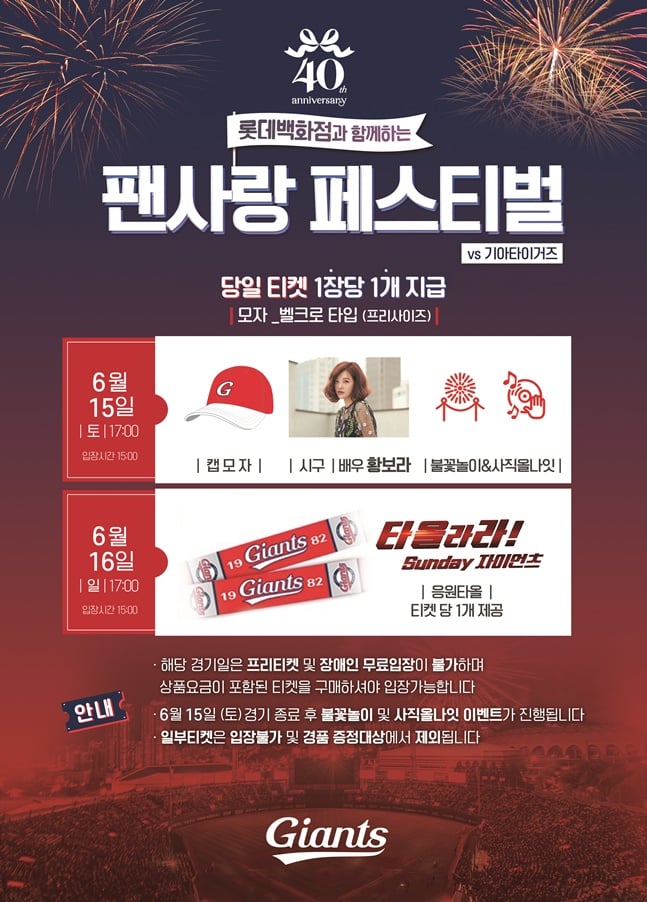 롯데자이언츠는 오는 15일과 16일 열리는 KIA와 홈경기를 맞아 ‘롯데백화점과 함께하는 팬사랑 페스티벌’을 개최한다고 12일 밝혔다.