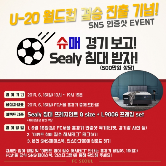 ‘초여름 밤의 축구 축제’라는 콘셉트로 슈퍼매치를 준비 중인 FC서울은 슈퍼매치 참여 팬들을 대상으로 SNS 인증 이벤트를 통해 500만원 상당의 씰리침대 Q사이즈와 프레임세트를 경품으로 제공할 예정이다.