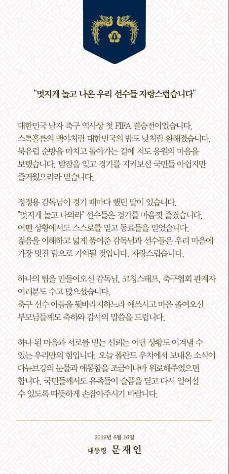 이에 문재인 대통령은 폴란드에서 맹활약을 펼친 정정용호의 노력을 크게 칭찬했다. 문재인 대통령은 축전을 통해 "대한민국 남자 축구 역사상 첫 FIFA 결승전이었다. 스톡홀름의 백야처럼 대한민국의 밤도 낮처럼 환해졌다. 북유럽 순방을 마치고 돌아가는 길에 응원의 마음을 보탰다. 밤잠을 잊고 경기를 지켜보신 국민들도 아쉽지만 즐거웠으리라 믿는다"라며 아낌없는 박수를 보냈다.