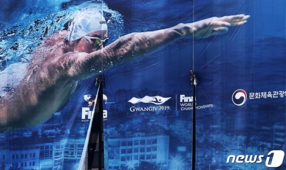 지난 23일 오후 서울 종로구 정부서울청사 외벽에 2019 광주세계수영선수권대회를 알리는 대형 현수막이 부착되고 있다. /사진=뉴스1