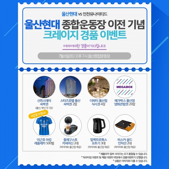 울산은 7월 6일(토) 오후 7시 열리는 인천유나이티드와의 첫 경기부터 풍성한 행사와 경품을 준비했다.