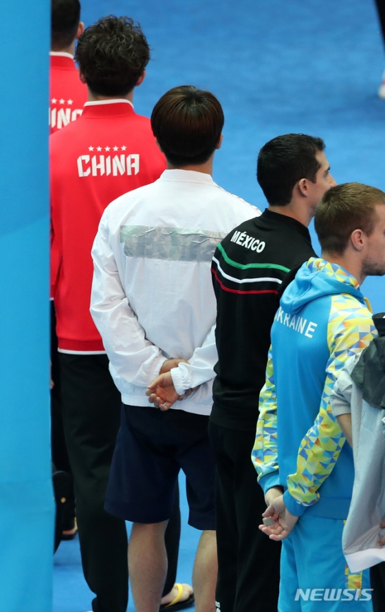 뉴시스에 따르면 지난 14일 대회 남자 다이빙 1m 스프링보드 결승에 앞서 선수 소개를 할 때 대표팀 우하람(21·국민체육진흥공단)이 입은 트레이닝복 등 부분에는 은색 테이프가 여러 겹 붙어 있었다. 결승에 오른 12명 중 트레이닝복 뒷면에 나라 이름이 없는 선수는 우하람이 유일했다.