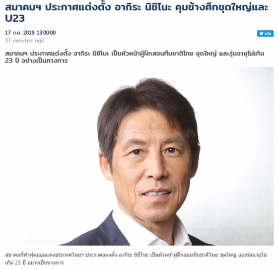 태국축구협회는 17일 니시노 감독 선임을 공식 발표했다. 태국은 니시노 감독에게 2022 카타르 월드컵 2차예선을 비롯해서 2020 도쿄 올림픽 예선을 겸하는 아시아축구연맹(AFC) U-23 챔피언십, 동남아시안게임 등 태국이 치러야 할 굵직한 대회의 모든 지휘봉을 맡겼다.