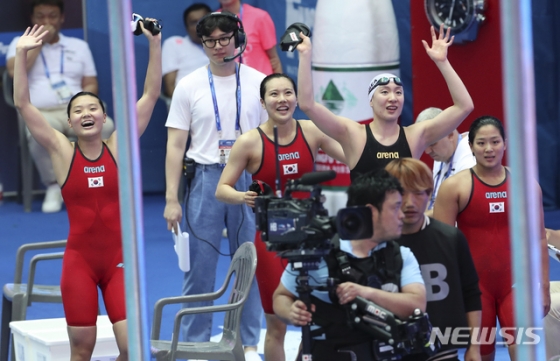 한국 여자 계영 대표팀은 21일 광주 남부대 시립국제수영장에서 열린 대회 계영 400m 예선 2조에서 이근아(경기체고)·정소은(서울시수영연맹)·최지원·정유인(이상 경북도청) 순으로 레이스를 펼쳐 3분42초58로 터치패드를 찍었다. 계영 400m는 4명의 선수들이 자유형으로만 100m씩 소화하는 방식으로 진행된다.