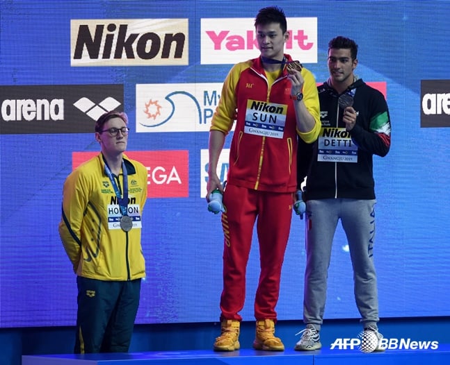 쑨양은 지난 21일 광주 남부대 시립실내수영장에서 열린 2019 광주세계수영선수권 남자 자유형 400m 결승서 3분 42초 44로 1위를 차지했다. 호튼은 3분 43초 17로 쑨양에게 0.73초 차이로 밀려 2위를 기록했다. 데티 가브리엘레(이탈리아)가 3분 45초 23으로 3위였다.
