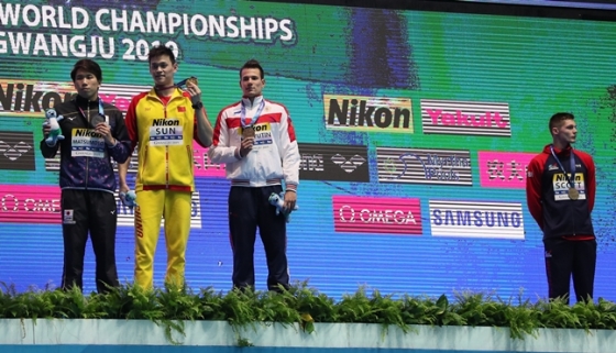 쑨양은 지난 23일 광주 남부대 시립국제수영장에서 열린 대회 남자 자유형 200m 결승서 1분44초93으로 2번째로 터치패드를 찍었으나 가장 빨랐던 다나스 랩시스(24·리투아니아)가 부정 출발로 실격당하면서 금메달을 차지했다.