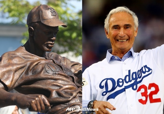 다저 스타디움의 재키 로빈슨 동상(좌)과 다저스의 전설 샌디 쿠팩스. /AFPBBNews=뉴스1