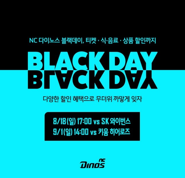 다양한 할인 혜택으로 무장한 NC의 블랙데이는 8월 11일부터 다이노스 홈페이지와 티켓링크에서 예매 가능하다.