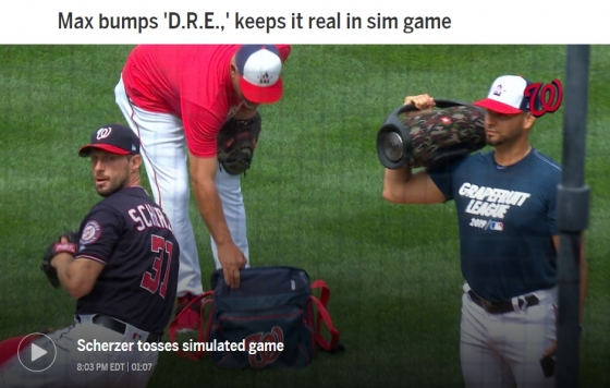 연습투구에 등장음악까지 큐! 슈어저 재활에 동료들 총출동