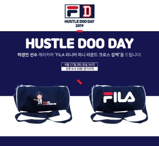 이번 '휠라 허슬두데이' 주인공은 내야수 허경민(29)이다. 이날 두산은 레드석 102, 202 블럭을 ‘휠라허슬두A존’, 레드석 101, 201 블럭을 '휠라허슬두 B존'으로 편성해 이 좌석을 예매한 팬들에게 허경민 캐리커처가 새겨진 'FILA 리니어 미니 라운드 크로스 짐백'을 선물한다.