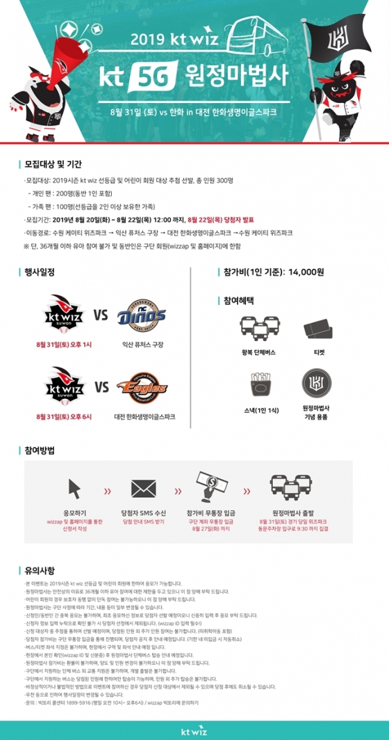 특히, 이번 대전 원정 마법사는 kt wiz의 익산 퓨처스 경기와 대전 1군 경기를 연이어 응원하는 일정으로 마련됐다. 먼저, 팬들은 31일 오후 1시부터 kt wiz 퓨처스 연고지인 익산 구장에서 진행되는 kt wiz와 NC 다이노스의 퓨처스 경기를 관전한다. 경기 모습을 자주 볼 수 없었던 퓨처스 선수들을 만나고 김주일 응원단장과 함께 선수들을 응원하게 된다. 이어서, 대전으로 이동해 kt wiz와 한화 이글스의 1군 경기에서 단체 응원전을 펼치며 열기를 고조시킬 예정이다.