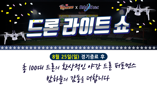 SK 와이번스가 25일 KIA 타이거즈와의 홈경기 종료 후 군집드론 운용기술을 활용한 이색 라이트쇼를 진행한다.