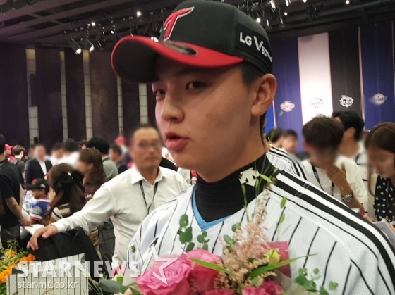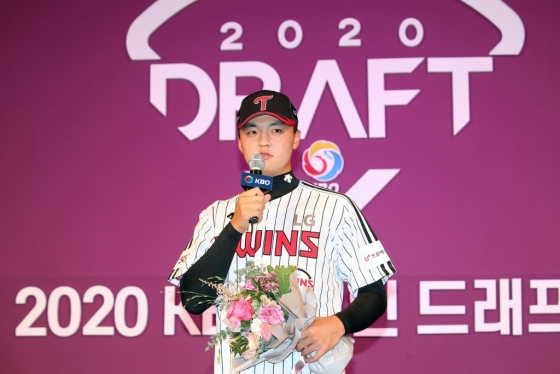 이날 LG 1차 지명 이민호도 행사에 참여해 차명석 LG 단장으로부터 유니폼과 함께 기념촬영을 하며 2020시즌에 대한 각오를 다졌다. 특히 차 단장과 함께 미리 준비한 하트 세리머니까지 보이는 찰떡 호흡을 보였다.