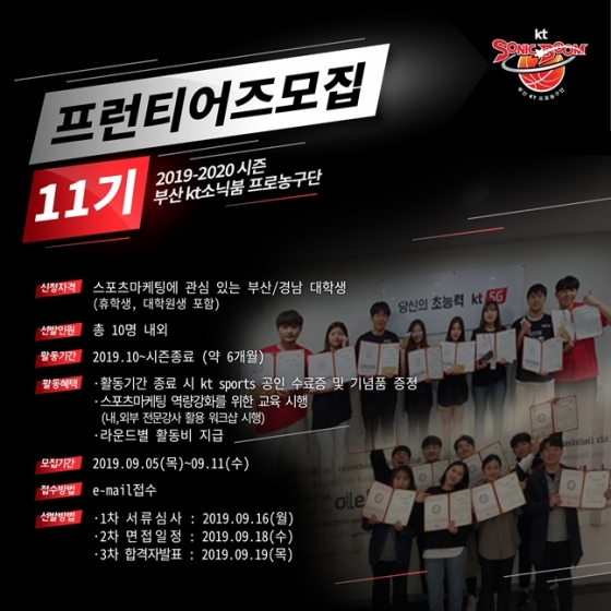 부산 KT 소닉붐이 올해로 11년째를 맞는 대학생 스포츠마케터 육성 프로그램인 '프런티어즈'를 선발한다고 5일 밝혔다.