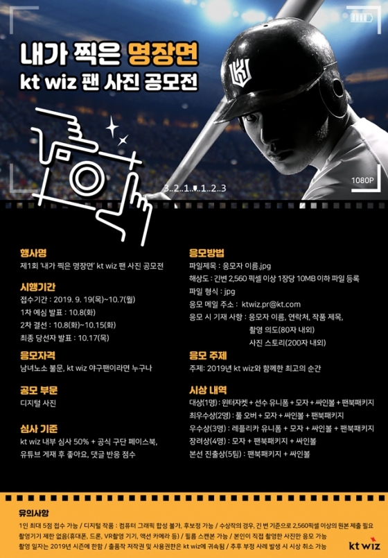 '내가 찍은 명장면'이라는 타이틀로 진행되는 이번 공모전은 19일부터 10월 7일까지 진행되며 kt wiz 팬들이면 누구나 참여 가능하다. 주제는 '2019년 kt wiz와 함께한 최고의 순간'이며 1인당 최대 5점의 디지털 작품을 KT 구단 공식 메일로 접수 가능하다.