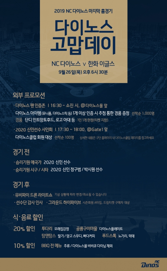 NC 다이노스가 26일 창원NC파크에서 열리는 2019시즌 정규리그 마지막 홈경기를 '다이노스 고맙데이'로 열고 팬들을 맞이한다.