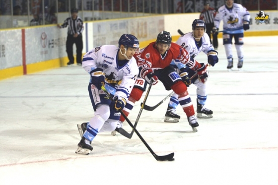 안양 한라가 골리 '한라성' 맷 달튼의 33세이브 선방과 2분 동안 3골을 뽑아내는 집중력을 발휘해 오지 이글스에 4-2로 승리했다.