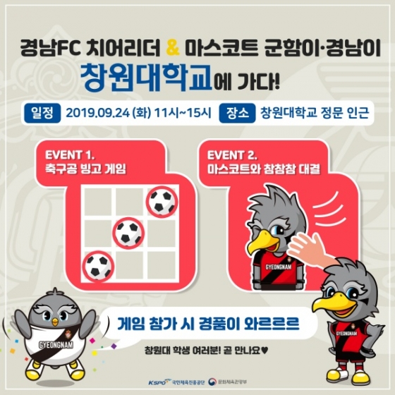 경남은 보도 자료를 통해 24일(화) 오전 11시부터 오후 3시까지 창원대학교 정문 인근에서 경남FC 홍보부스를 운영한다고 전했다. 이 날 홍보부스에는 경남 치어리더인 ‘루미너스’와 마스코트 ‘군함이와 경남이’가 참여한다.