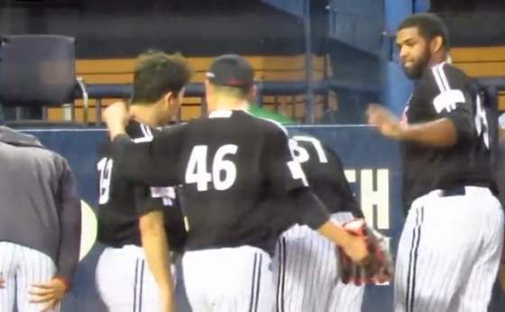LG가 22일 잠실에서 두산을 연장 접전 끝에 6-3으로 이긴 뒤 한 동영상이 온라인에서 화제가 됐다. LG 선수들이 승리 후 도열해 세리머니를 펼치고 있었다. 경기를 마무리한 베테랑 투수 송은범(35)이 이날 블론세이브를 기록한 고우석(21)의 머리를 쓰다듬으며 격려하는 모습이었다.