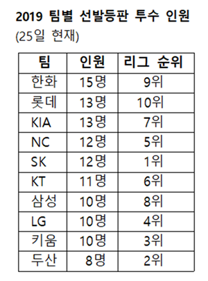 이들 외에 한화는 김민우, 김진영, 박주홍, 임준섭, 이태양, 송창현, 김재영, 문동욱, 김성훈, 박윤철 등 무려 총 15명이 올 시즌 최소 1경기 이상 선발로 나갔다. 10개 구단 중 가장 많다. 하지만 선발로서 이렇다 할 모습을 보여주지 못한 채 늘 테스트에 그치고 말았다.