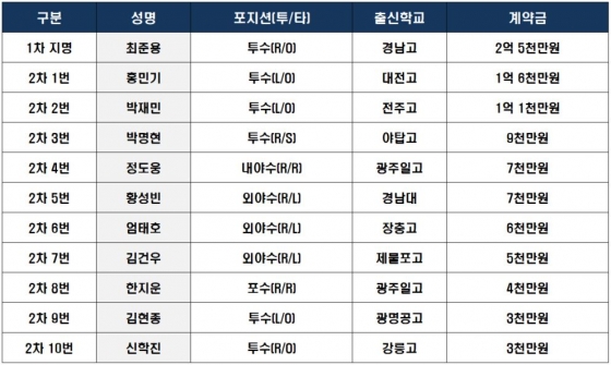 또, 2차 2번 전주고 좌완 투수 박재민 선수는 1억 1천만원에, 2차 3번 야탑고 우완 투수 박명현 선수는 9천만원에 계약했다
