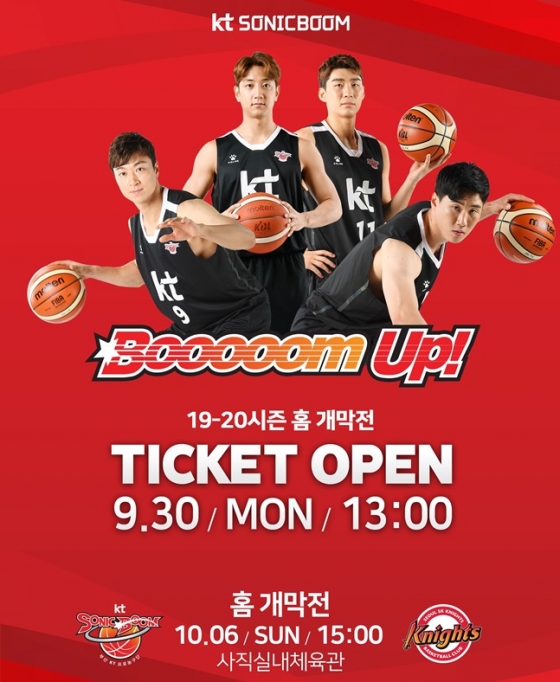 부산 KT 소닉붐이 10월 6일 오후 3시에 사직실내체육관에서 서울 SK와 맞대결로 2019~2020시즌을 시작한다. 이에 앞서 27일 홈 개막전 티켓 판매를 개시한다.