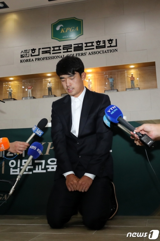 손가락 욕설로 논란을 일으킨 김비오(29·호반건설)가 1일 오전 경기도 성남시 분당구 한국프로골프협회에서 열린 상벌위원회를 마친 뒤 무릎꿇고 사죄하고 있다./사진=뉴스1