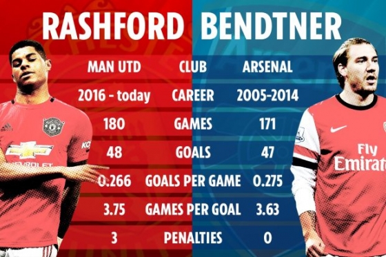 그런데 래시포드의 기록이 아스널 시절 벤트너보다 못하다는 주장이 나왔다. 아스널에서 171경기를 뛴 벤트너는 47골을 넣었다. 경기당 0.275골, 3.63경기당 1골씩을 넣으며 기록상 래쉬포드보다 나은 게 맞았다. 물론 벤트너는 아스널에서 9년 동안 기록이다.