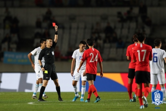 1-1 승부를 원점으로 돌린 가운데, 한국에 호재가 찾아왔다. 후반 40분 루스타모프가 센터 서클 근처에서 강윤성에게 정강이 쪽을 향한 높은 스탠딩 태클을 시도 퇴장을 당했다.