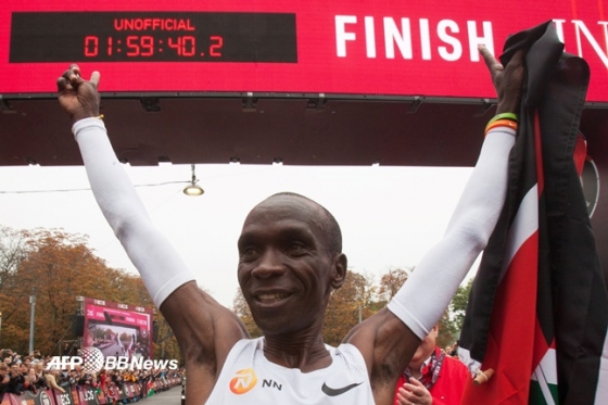 케냐의 일리우드 킵초게(35)가 42.195km를 1시간 59분 40.2초에 주파했다. 인류 최초로 마라톤 코스를 2시간 이내에 완주했다.