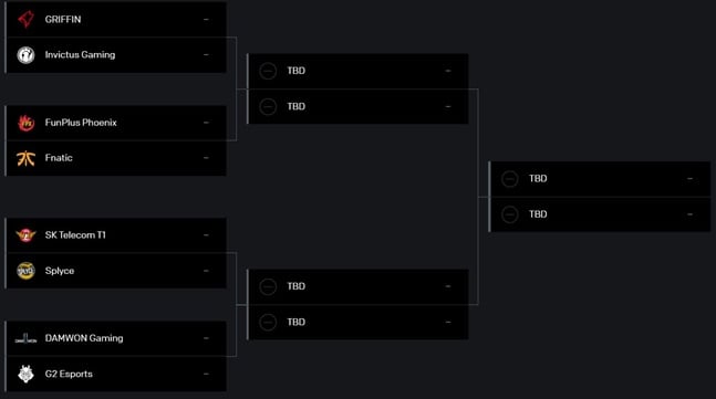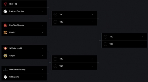 이어지는 두 번째 경기에서는 펀플러스 피닉스와 프나틱이 맞붙는다. 27일 오후 8시 세 번째 경기는 SK텔레콤 T1과 스플라이스 간 대결로 결정됐으며 이어지는 마지막 경기는 담원 게이밍 대 G2 이스포츠로 확정됐다. 8강부터 결승까지는 모두 5전 3선승제 토너먼트로 진행된다.