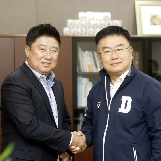 김태형 감독이 재계약 도장을 찍은 후 두산 베어스 김태룡 단장(오른쪽)과 악수를 나누고 있다. /사진=두산 베어스 제공