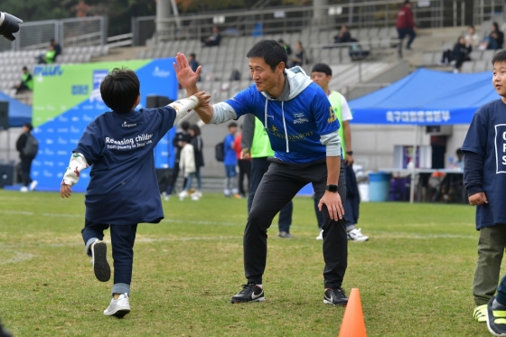 이영표(42)가 축구를 통해 아이들과 하나가 됐다. 이날 행사에는 이영표를 비롯해 김병지(49), 송종국(40), 김용대(40), 김형범(35)이 참석, 뜻깊은 시간을 보냈다.