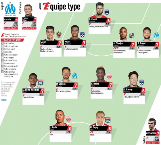 프랑스풋볼이 선정한 베스트11에는 황의조를 비롯해, 데파이, 앤디 델로(몽펠리에), 무니르 추이아(디종), 디디에 은동(디종), 발렌틴 론지어(마르세유), 조던 아마비(마르세유), 로메인 토마스(앙제), 아우렐리엥 체주(아미앵), 유세프 아탈(니스), 브누아 코스틸(보르도) 등이 선정됐다.
