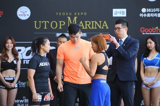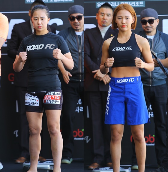 이은정(25·제주 팀더킹)과 박지수(19·순천 프리짐)는 8일 여수 유탑 마리나 호텔 3층 야외수영장에서 열린 굽네몰 ROAD FC 056 계체량을 통과했다.