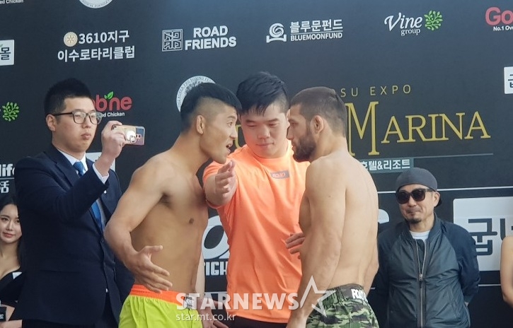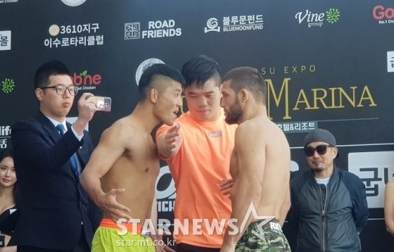 권아솔과 샤밀 자브로프의 굽네몰 ROAD FC 056 계체량이 8일 여수 유탑 마리나 호텔 3층 야외수영장에서 열렸다. 두 선수 모두 계체량을 통과했다. 이날 권아솔은 샤밀 자브로프를 향해 갑자기 얼굴을 확 들이대며 도발했다. 샤밀 자브로프는 꿈쩍도 하지 않았다.