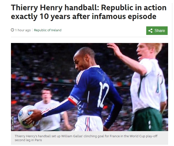 당시 아일랜드는 1-0으로 이기고 있었지만 후반 추가시간 동점을 허용했다. 앙리가 왼손으로 공을 받아 놓은 뒤 윌리엄 갈라스에게 연결, 아일랜드를 떨어뜨린 통한의 득점으로 이어지고 말았다.