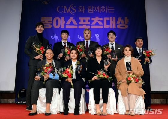 각 종목별 올해의 선수상 수상자들이 11일 서울 광화문 포시즌스호텔서울에서 열린 ‘CMS와 함께하는 2019 동아스포츠대상’ 시상식에서 기념촬영을 하고 있다. /사진=뉴시스(스포츠동아 제공)