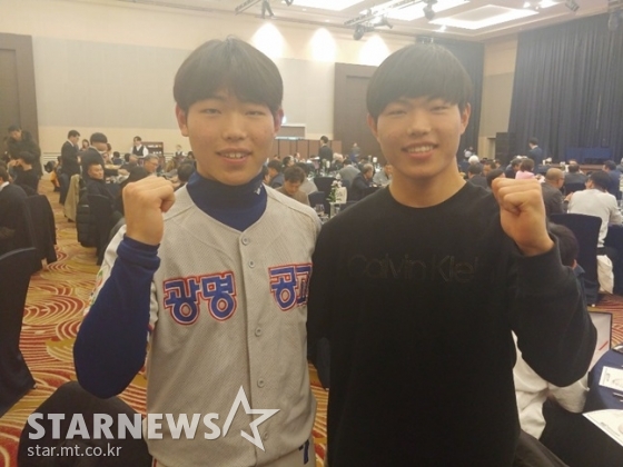 2019년 이영민 타격상 수상자 박정우(왼쪽)가 쌍둥이 동생 박정인과 포즈를 취했다. 프로에 지명받지는 못했지만, 박정우는 성균관대에서, 박정인은 독립구단에서 야구를 이어간다. /사진=김동영 기자