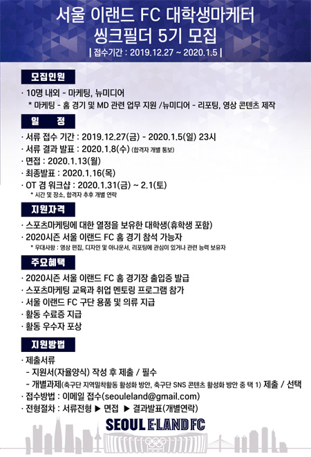 [스포탈코리아] 김성진 기자= 서울 이랜드가 27일부터 1월 5일까지 2020시즌 대학생마케터 씽크필더 5기를 모집한다.