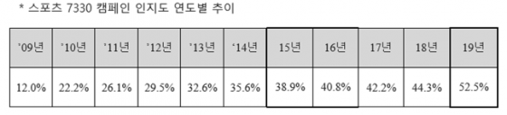 대한체육회가 8일 발표한 조사 결과에 따르면 ‘생활체육 7330(일주일에 세 번 이상, 하루 30분 운동) 캠페인에 대해 얼마나 알고 있는가’라는 질문에 52.5%가 알고 있다고 답했다. 지난해 44.3%에 비해 8.2%포인트 올랐다.
