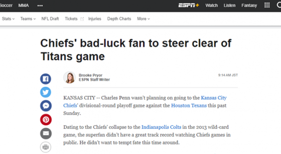 그런데 그런 생각을 하는 사람이 미국에도 많은 모양이다. 특히 지난 주말 미국프로풋볼(NFL) 플레이오프에서 한 미국인 팬의 경우는 스토리가 하도 리얼하고 절실해 졸지에 유명인사가 됐고 그의 사연은 ESPN에까지 보도됐다. 찰스 펜이라는 캔자스시티 칩스의 한 ‘슈퍼 팬’ 이야기다. 그의 스토리를 소개한다.